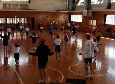 全校体育では、なわとびの練習が行われています。なわとび名人をめざして、目標とする技や回数を跳べるように真剣でした。写真は、低学年から中学年の子どもたちの跳んでいる瞬間です。高く跳び、速く縄を回していますね!