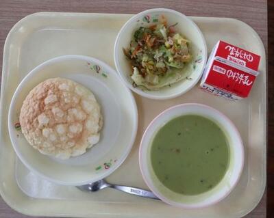 今日の給食の献立は、牛乳、りっちゃんサラダ、グリーンポタージュ、メロンパンでした。ベジ活の日ということで野菜をふんだんに使った栄養満点のサラダとポタージュスープでした。そして、メロンパン!子どもたちも、先生たちも給食で食べるのは初めてでした。給食前には、廊下のあちらこちらで、「今日は、メロンパンなんだってよ。」と話題になっていました。霧島ベーカリーさんの立派なメロンパンにガブリと食いつくと、優しい甘さが口いっぱいにひろがりました。いつもおいしい給食をありがとうございます。