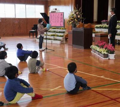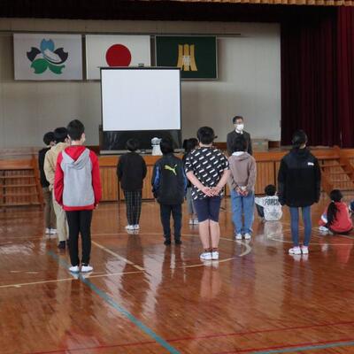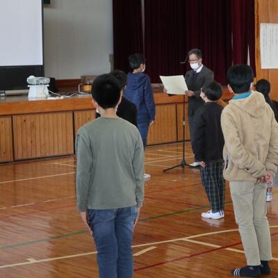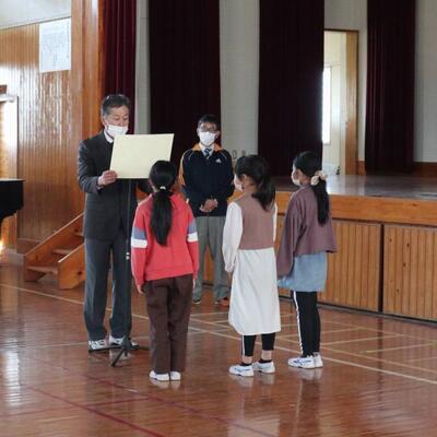 6年生が卒業し、いつもよりちょっぴり広く感じる体育館で、修了式が行われました。1~5年生の代表が修了証を校長先生からいただきました。校長先生からのお話では、修了式の「修」の字について教えていただきました。2名の児童の作文発表は、この1年の思い出や次の学年でがんばりたいことを上手に伝えました。麓っ子全員が無事に1年間の学業を修めることができました。