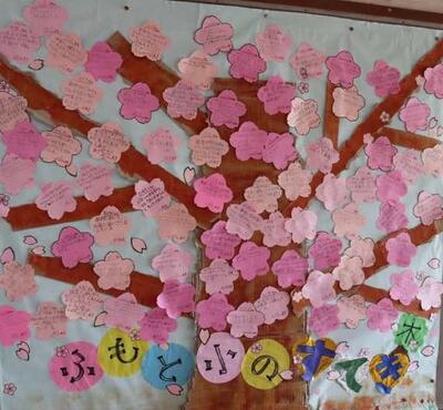 「友だちに優しくしてもらった」「友だちがよい行いをした」思いやりのある行いを見つけたら、桜の花びらに書いて貼る『ふもと小のすてき(木)』が行われています。始まって数日ですが、花が咲きはじめています。すぐに満開になるでしょう。暖かい春はもうすこし先ですが、ふもと小は友だちの思いやりある行動で、心あたたかです。