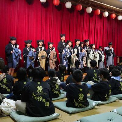「人形の館」にて人形浄瑠璃定期公演が行われました。保存会の方々に教えていただきながら6月から練習を重ねてきた5・6年生。本番はこれまで以上の人形の操りでした。たくさんのお客様の前での舞台を踏ませていただき、一生の思い出になったことでしょう。写真は演目後の自己紹介をしている5・6年生です。充実感で満たされて、清々しい表情です。保存会の先生方、山之口総合支所の方々、地域の方々、保護者の方々、そして公演を観に来て下さったお客様、本当にありがとうございました。6年生が卒業すると、新5・6年生がこの伝統を受け継いでいきます。