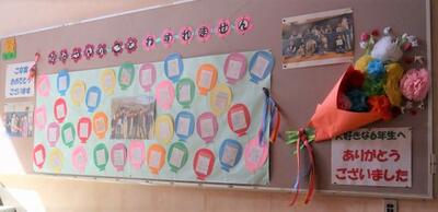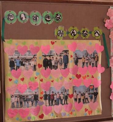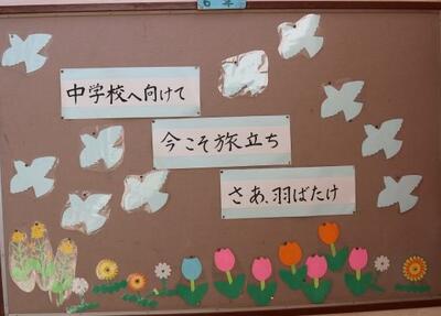 6年生の卒業まであとわずかです。卒業式の練習が行われています。そして、階段の掲示板には、卒業を祝う飾りやメッセージ、6年生から在校生へのメッセージが掲示されました。6年生と一緒に登校するのも、昼休みに遊ぶのも残りわずかです。