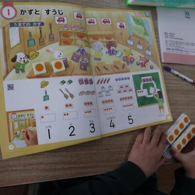 入学して間もない1年生もお勉強をがんばっています。算数は、「教科書の絵にかいてあるものがいくつかな?数図ブロックをおいて、いくつあるか数えてみよう。」という数の学習でした。数図ブロックの個数を数字でかくと、「1」「2」だねと数字も学習しましたよ。先生の指示を集中して聞き、数を数えることができました。