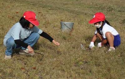 朝のボランティア活動がはじまりました。1~6年生で構成される縦割り班で行います。今日は、6年生が1年生に草取りの道具の使い方を優しく教えてくれていました。異学年で協力して作業をすることで、絆が深まります。