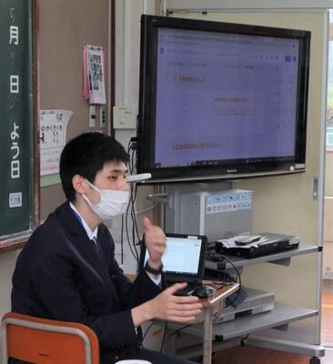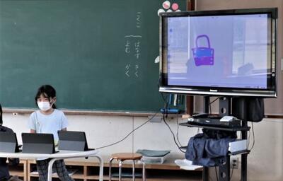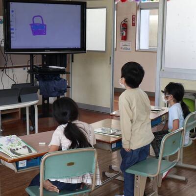 1年生の授業は、自己紹介でタブレットに書いた絵をみんなに発表しました。質問もしっかりできましたよ。