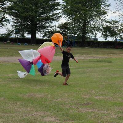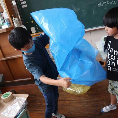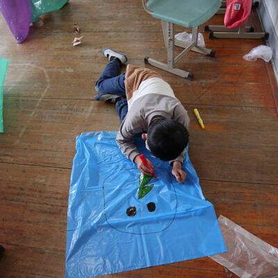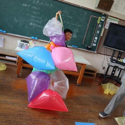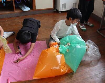 3・4年生は色のついた袋をつなげたり、絵を描いたりして、袋の風船のつみきを作りました。大きな袋にどんな絵を描こう、どうやってつなげようかと、夢中で作っていました。できた作品を運動場の鉄棒やジャングルジムに飾ったり、持って走ったりして完成を楽しみました。