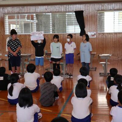 全校集会がありました。校長先生は、端午の節句にちなんだ「かしわ餅」やゴールデンウィーク等の安全な過ごし方について話をしてくださりました。また、5月の目標「学習のやくそくを守ろう。」について、委員会の児童が学習中の姿勢を分かりやすく劇で表してくれました。