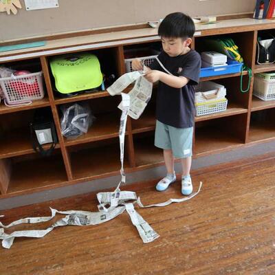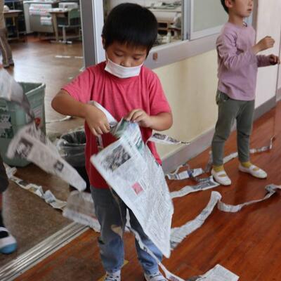 1・2年生の図工です。新聞紙をちぎり、なが~くつなぎました。長くするために、どうやってちぎればいいか試行錯誤。友達と新聞紙をつないで、長くなったのがとてもうれしく、歓声があがりました。長くなった新聞紙を高く持ち、走ってなびかせようともしました。子どもたちはとても夢中でしたよ。