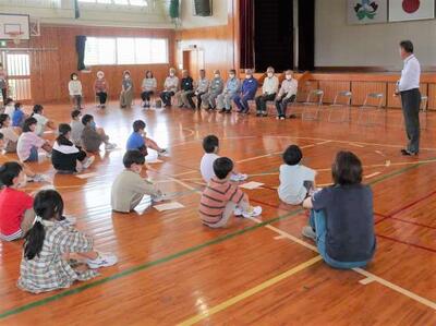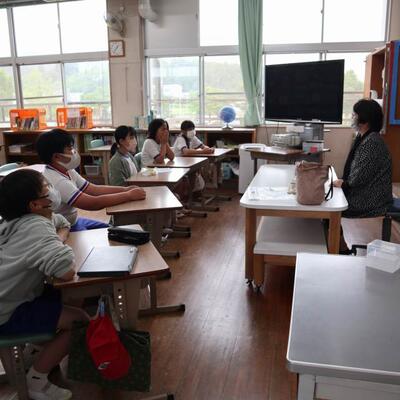 3・4年生は総合的な学習の時間で、6日に行われる田植えについて先生からお話を聞いていました。天気が心配ですが、米づくりボランティアの方が田の準備をして下さっています。田植えが楽しみです。