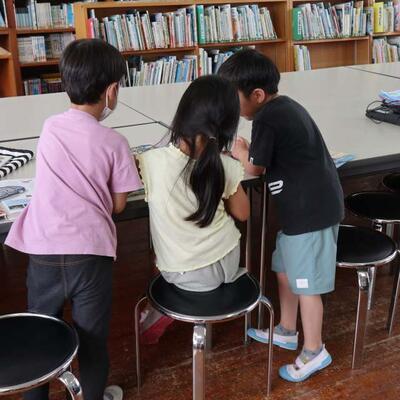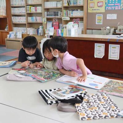 1年生は図書館で読書の時間でした。お友達が選んだ本がとても気になります。3人集まっているうしろ姿から仲の良さが伝わってきます。