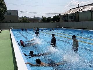 着衣泳を行いました。洋服を着たままでは、泳げないことを体験させました。当然ですが、洋服が邪魔してなかなか水の中では思い通りいきません。夏休み、校区内では学校のプール以外で水泳ができる場所はありません。今日の経験を生かすことがない楽しい夏休みにしましょう。