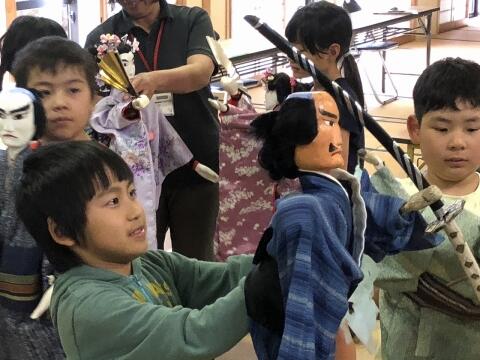 5・6年生が、人形浄瑠璃保存会の方に教わりながら練習しています。