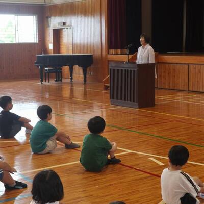 7月全校集会が行われました。今月は、校長先生がビデオ撮影された「掃除の様子」を見ました。全校児童が34名と少ないので、校舎全体を掃除するのも大変です。いつも掃除の時は無言で時間いっぱい床を拭いています。掃除が終わることはクタクタです。そのように頑張っている自分たちの姿を見て、精一杯やることの充実感、満足感、みんなのために行っているという気持ちをもてました。無言で頑張る麓小の掃除の時間は伝統となりつつあります。
