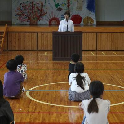 新しい先生が麓小に仲間入りしました。今日は、先生から全校児童にあいさつがありました。笑顔が素敵で優しそうな先生です。みんな目を輝かせ、先生を歓迎しました。