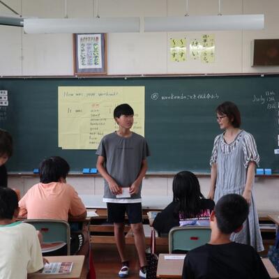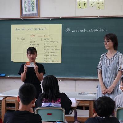 5・6年生はALTと一緒に外国語の学習をしています。今日は自分の「week end」について、英語で伝えました。休日に何をして過ごしているか、いくつも文章を書いていました。聞いている友だちも集中して聞いていましたよ。
