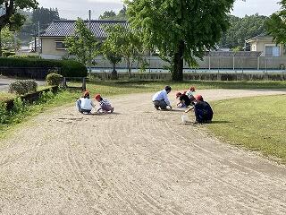 今朝の朝のボランティアは、運動場フィールドの石拾いや草取りでした。体力テストもあるので危険な石を取り除きました。