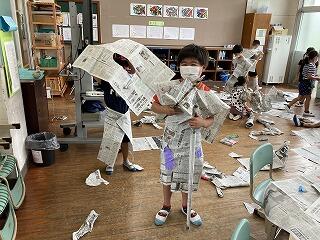 1・2年生の図工の学習で新聞紙を使って洋服を作ったり、剣などの小物を作ったりしました。できあがったらみんなで記念撮影をしました。