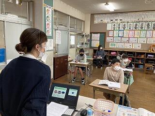 1年生は、国語でことばをみつけようの学習をしています。例えば、「みかんの中にはかんがある」みたいに単語の中にあることばをみつけたり自分たちで文章を考えたりしていました。2年生は、算数で「はこの形」について学習していました。面の形についてどんな形がを調べていました。