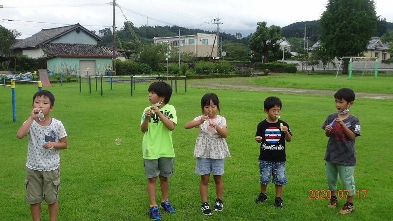 1年生が、シャボン玉遊びをしています。最近は雨が多くなかなか外での活動が出来ないことが出来ませんでした。今日は、少し太陽が顔を出してくれたのでシャボン玉遊びが出来ました。大きくふくらんだシャボン玉を追っかけたりして楽しく過ごしていました。