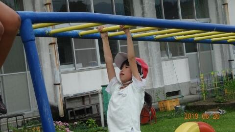 体育の授業は、1年生と2年生が一緒に行っています。ぶら下がり棒を力強く進んでいます。最後まではなかなか難しいですが、友達に応援されて一生懸命がんばりました。
