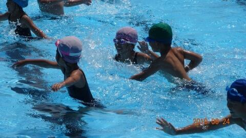 着衣泳を行いました。洋服を着たままでは、泳げないことを体験させました。当然ですが、洋服が邪魔してなかなか水の中では思い通りいきません。夏休み、校区内では学校のプール以外で水泳ができる場所はありません。今日の経験を生かすことがない楽しい夏休みにしましょう。