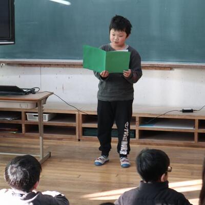 2学期の終業式が行われました。1年生、3年生の代表児童が、2学期の思い出や3学期がんばりたいことを作文発表しました。「子牛のミルクを作ったり、お母さんのお手伝いをしたいです。」「テストで100点が取れるようにがんばります。」2人ともそれぞれの思いを読み上げました。