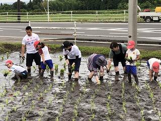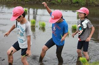 今年から全校児童で田植えをすることになり、上学年は下学年を助けながら