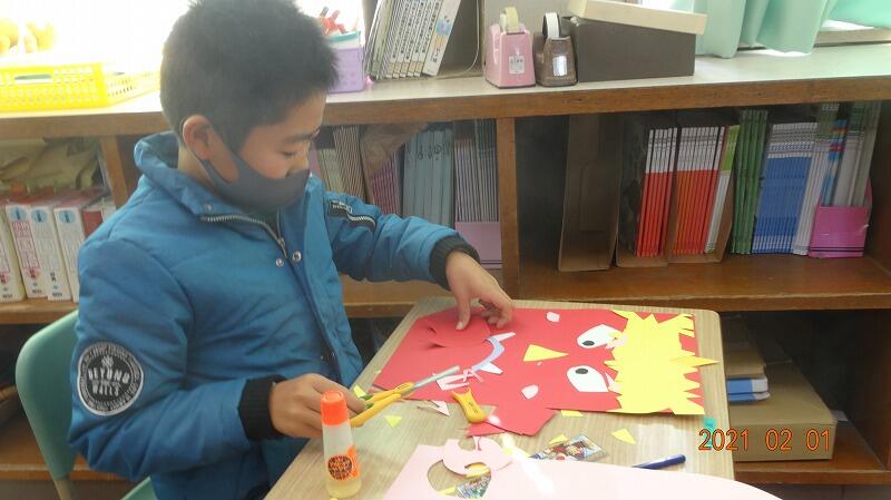 明日は、節分。そこで、3・4年生は鬼の面を作っていました。一人ひとりが思い思いに自分のイメージした鬼を作成していました。それぞれが、追い出したい鬼を考えていることでしょう。