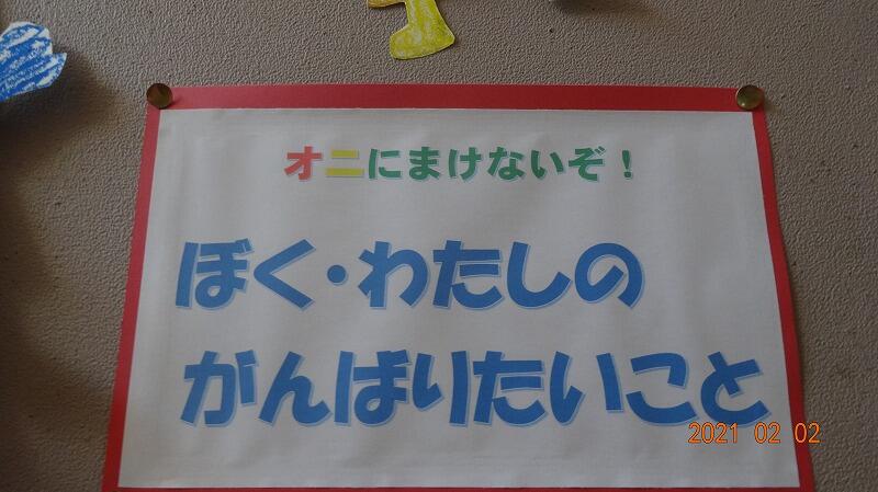 今日は節分です。2月2日の節分は124年ぶりだそうです。1年生が、「おににまけないぞ!がんばりたいこと」を掲示していました。がんばって、目標達成できますように。