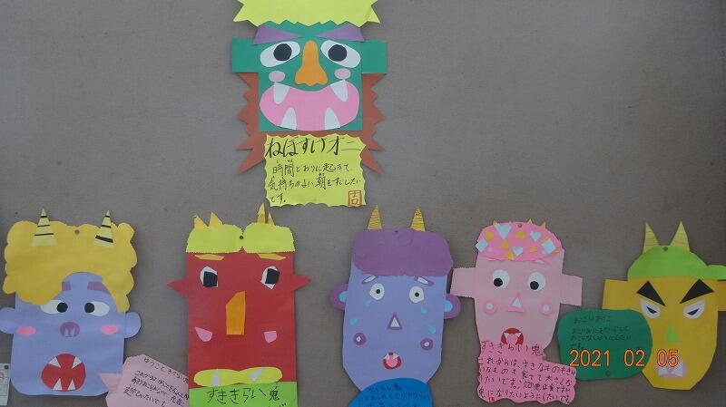 3・4年生が自分の中から追い出したい鬼を掲示しています。思い思いに作った鬼。季節を感じさせる掲示物です。