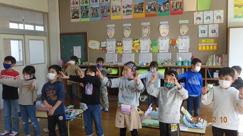 1・2年生が合同で音楽の授業を行っています。今は、コロナウイルス対策のために大きな声を出して歌うことが出来なくなっています。そこで、体を使って音楽に合わせて表現したりしています。
