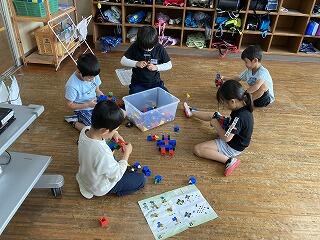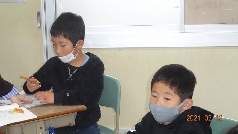 1年生は、国語でことばをみつけようの学習をしています。例えば、「みかんの中にはかんがある」みたいに単語の中にあることばをみつけたり自分たちで文章を考えたりしていました。2年生は、算数で「はこの形」について学習していました。面の形についてどんな形がを調べていました。