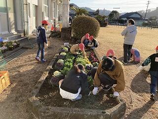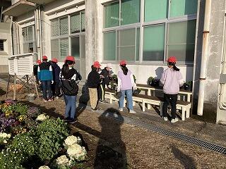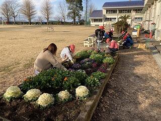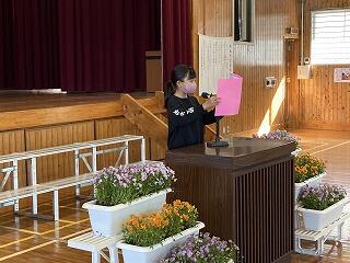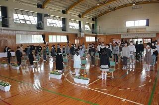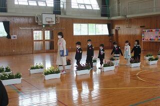 明日の卒業式に向けて、1年生から5年生が式場の準備をしました。自分たちで育てた花をプランタにいけて飾っていました。最後に、終わった花の摘み取り作業を行っています。明日、5名の児童が卒業していきます。
