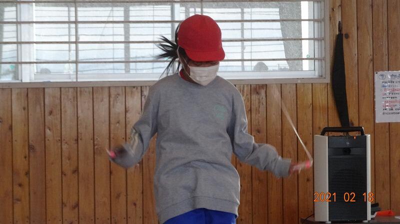 全校体育で、縄跳びチャレンジを行いました。全員で、前跳びを行い一人2種目の技にチャレンジしました。1分間で、どれくらい跳べるかをみんなの前で披露しました。緊張すると言いながら、跳んでいました。チャレンジ終了後、甘酒を頂きました。