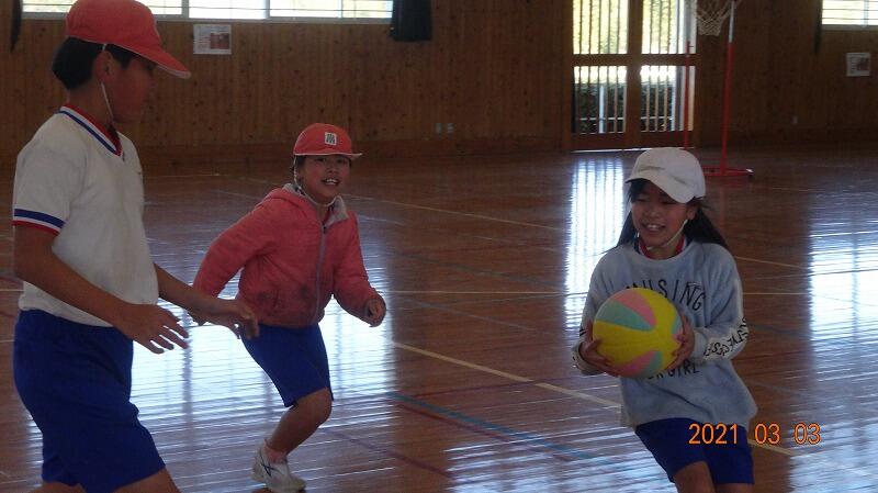 3・4年生の体育の授業です。バスケットボールみたいなボールゲームをしています。ゴールも低く設定してありますので、シュートも決めやすくなっています。パス中心にボールを進めて上手にシュートを決めていました。