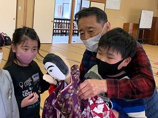 今年初の人形浄瑠璃伝承活動が行われました。最初ですので人形浄瑠璃保存会の方々と実行委員会を開いた後、子ども達を交えて開講式を行いました。その後、人形を触るのも初めての5年生を中心に人形に触ったり、動かし方の基本を学んだりしました。