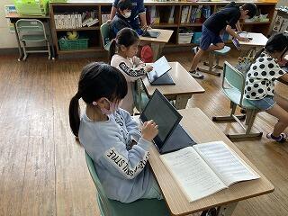 3・4年生が国語の時間に「報告する文章」をChrome book を使て書いていました。本やホームページの引用に気をつけながら「報告する文章」を書いていました。