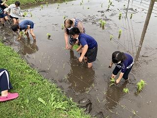 今年も地域の方々の協力を得て「麓っ子米」を植えました。1年生から6年生まで全員で協力して植えました。