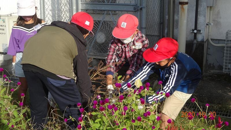 落ち葉の季節となりました。学級園も夏の花から秋へと植え替えの時期を迎えます。普段の清掃では、外掃除担任の児童がいないためみんなで朝の時間を使って清掃活動を行っています。