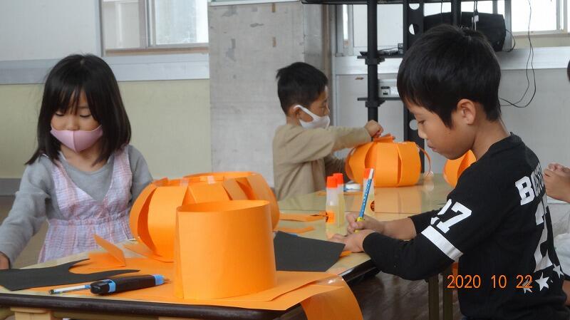 1年生が生活科の授業でハロウィンの飾りを作っています。小さな飾りや自分でかぶる大きさのものを作っています。切ったり貼ったりしてとても楽しそうです。