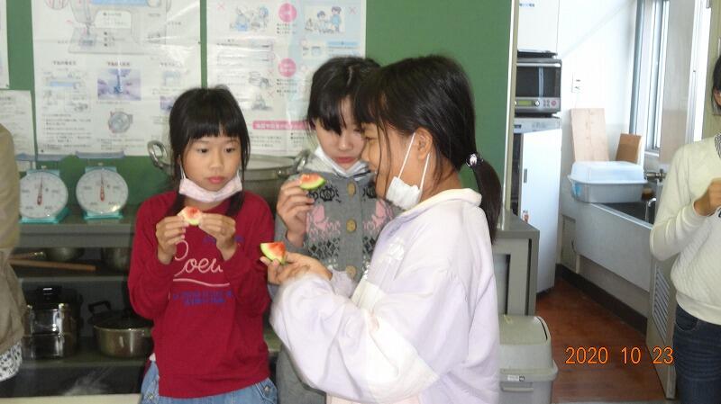 5・6年生が学級園で育ててきたスイカを、みんなで試食していました。大きく育てることは出来ませんでしたが、割ってみると綺麗に赤くなっていました。切ったスイカに顔を近づけてみるととても美味しそうなスイカのにおいがしてきました。とっても小さなスイカですので、一人分はほんの少しですので、みんな大事そうに味わって食べていました。