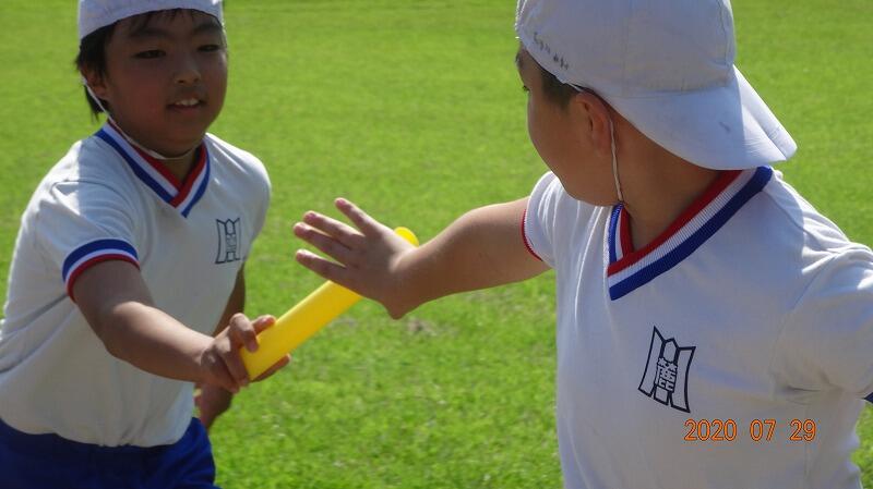 梅雨明けしたら夏本番。今日は、熱中症に気をつけながらの運動場での体育でした。運動会に向けて、リレーの練習を行いました。追い越したり追い越されたり、一人一人が一生懸命に走っていました。