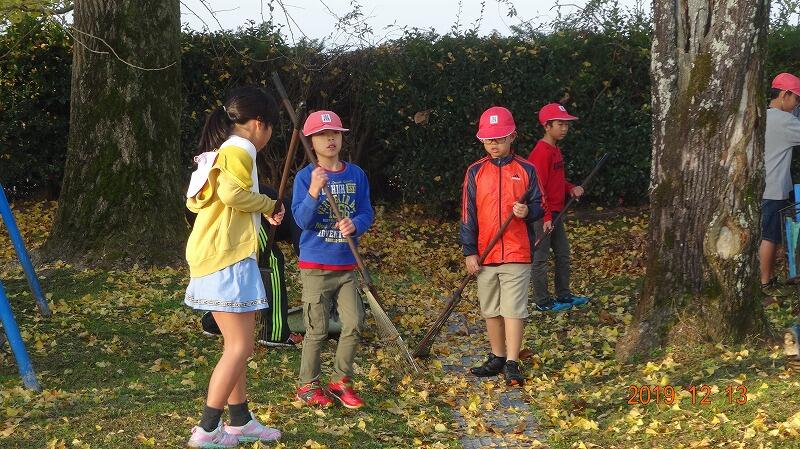 運動場のイチョウも黄色くなり、落ち葉として運動場に落ちています。その落ち葉を朝の時間に子どもたちが集めています。朝の寒い時間ですが、協力して活動しています。