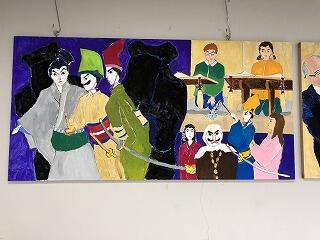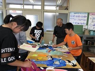 2学期に5・6年生は、人形浄瑠璃の練習風景の絵を色塗りして仕上げました。これは、昨年度の5・6年生をモデルに、艮さんが下絵を描き、今年度で仕上げたものです。麓っ子がつながって素晴らしい絵が仕上がりました。人形の館に2枚、掲げてあります。