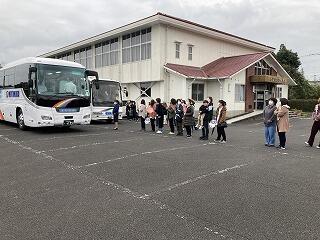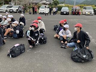 上富吉地区体育館に麓小・山之口小・富吉小の3校の6年生が集まって修学旅行の出発式を行いました。