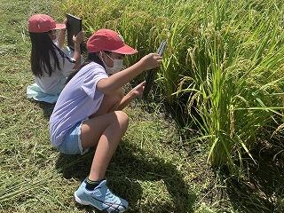 3・4年生が総合的な学習の時間にChromebookを使って稲の生長記録を撮っていました。