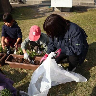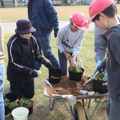 毎年恒例の一人5鉢活動を行いました。卒業式、入学式をお花で祝うために、子どもたちが育てていきます。今年はそれに加えて、創宮株式会社様による花植え活動も行われました。子どもたちと花植えボランティアの皆様、創宮の職員の方々とたくさんの花を植えることができました。子どもたちは、これから、3月に向けて、大事に大事にお花の世話をしてくれることでしょう。6年生が「最後の花植え活動となり、貴重な経験をさせてもらいました。たくさんの花を咲かせて、卒業式を迎えたいです。」と話をしてくれました。花植えボランティアの皆様には、植える手伝いや植えたプランターを一緒に運んでいただく等の御協力をいただきました。また、創宮様には、苗、土、プランターと子どもたちが活動しやすくなるよう、たくさんの準備をしていただきました。愛情をもって育てていきたいと思います。