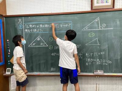 5年生算数の学習です。「三角形の3つの角の和は180度」を用いて問題の解説を行っています。答えを言うだけでなく、「図のこの部分がこのようになって・・・。」と聞いている友だちが「分かった!」と納得する説明を心がけて取り組んでいます。指し示したり、色を塗って分かりやすくしたりしながら説明することにより、自分の理解も深まっていきます。