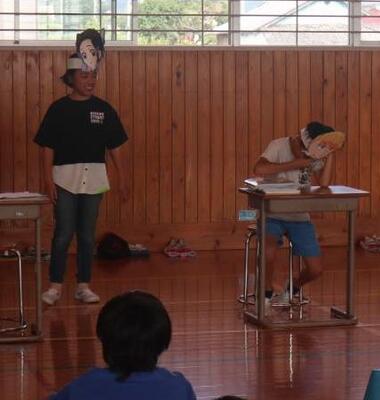 また、放送・図書委員会による劇が行われました。「7月月目標:計画的に学習しよう」について、夏休みの宿題の取り組み方を例に伝えてくれました。計画的に宿題や学習をすすめ、夏休み最後に頭をかかえることがないように・・・おもしろおかしく、とても分かりやすかったです。