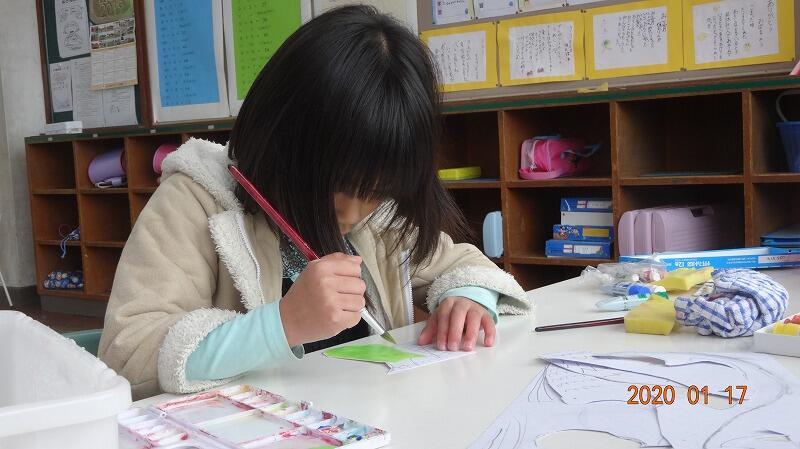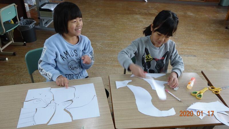 図工で、画用紙を自由に切ってその形を自分で何に見えるか想像して作品に仕上げる。一人一人の思いがあり、それぞれの作品づくりを行っています。図工の時間は、その子の思いを大切に作品を作り上げることを求めています。